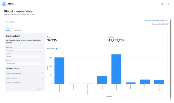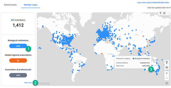 Global Member Data Reports provide a summary of all animal data in ZIMS, comprised of two components. Animal Charts offer interactive charts of global and institutional animal counts, with filters such as IUCN Red List, CITES, and taxonomy, updated weekly. Member Maps display the global locations of ZIMS member institutions.
